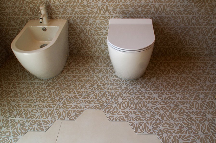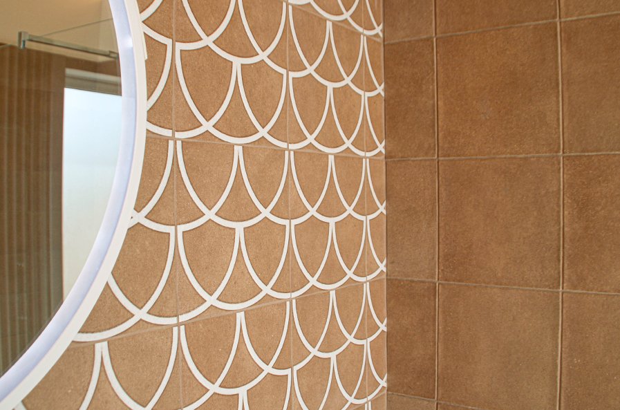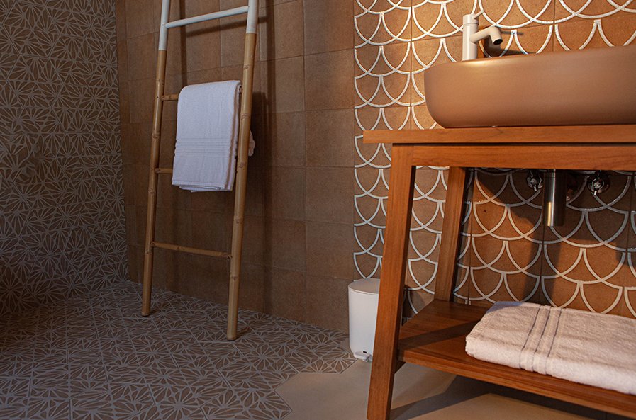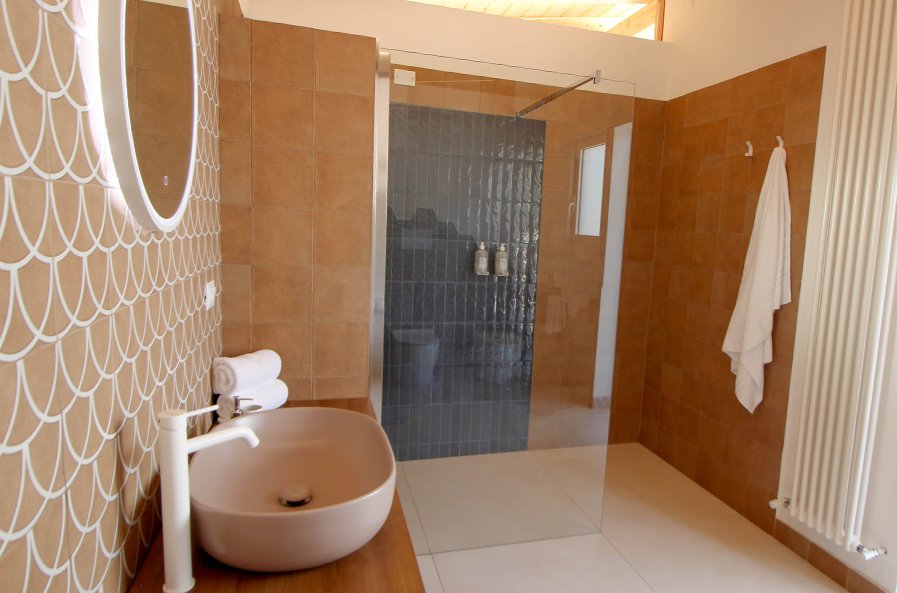 Terracreta: warm tones and chiselled surfaces recalling artisanal craftsmanship, for a welcoming and tactile bathroom.